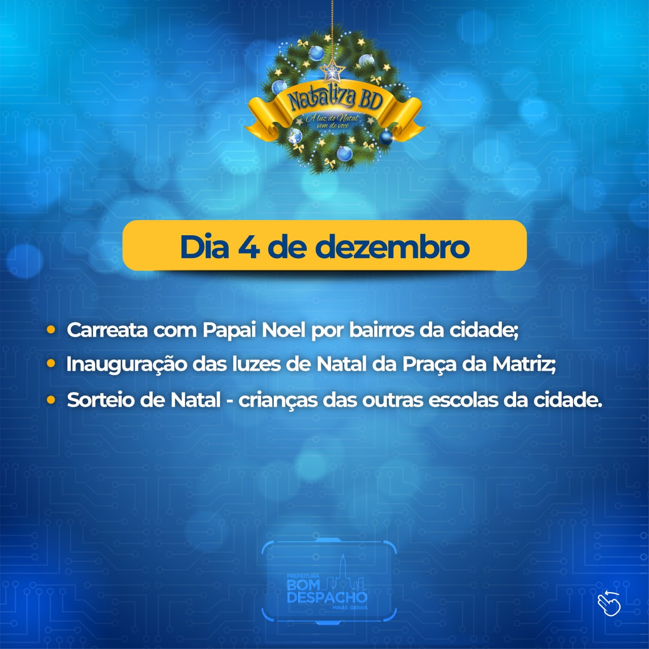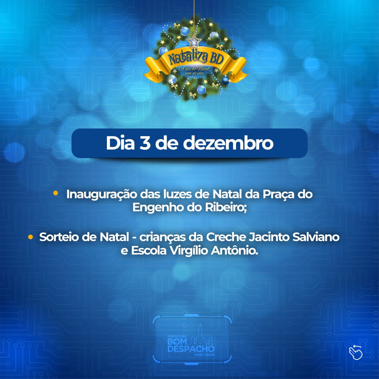 Serviços online serão mantidos mesmo durante feriado e ponto facultativo – Acesse bomdespacho.atende.net para requerer alvarás, emissão de nota fiscal, indicar lote sujo. Para Ouvidoria clique aqui e para indicar lâmpada queimada ligue 0800-606-1535.