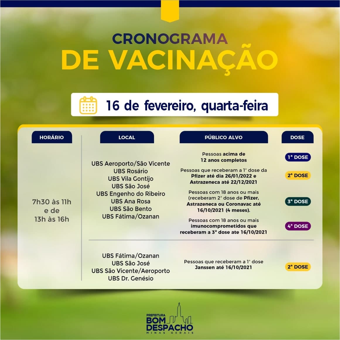 Confira os cronogramas de quarta-feira (dia 16) da vacinação contra Covid-19 e CLIQUE AQUI para acessar os requisitos de vacinação.