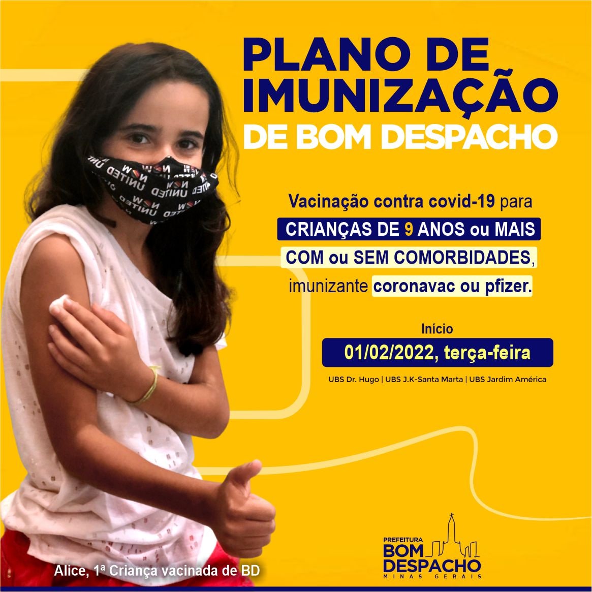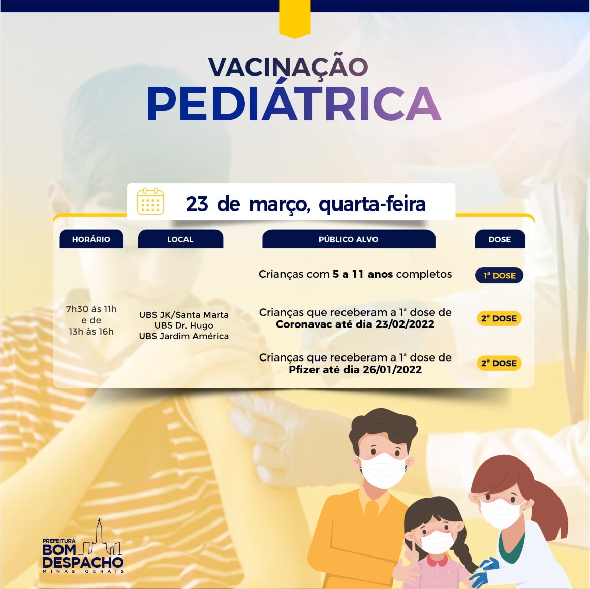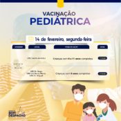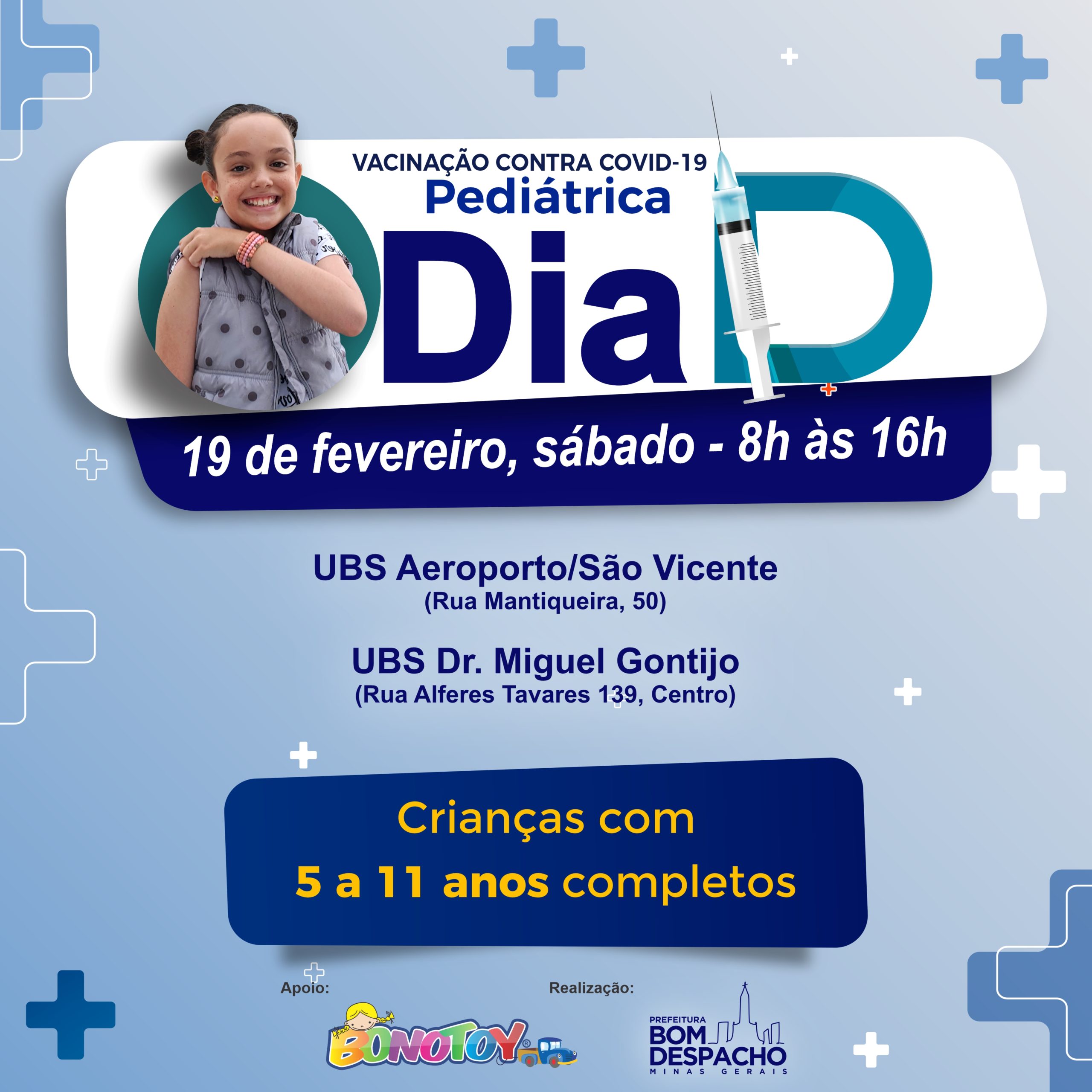 Sábado (dia 19) a Prefeitura realizará Dia D de vacinação pediátrica contra Covid-19. Leve seus filhos, de 5 a 11 anos de idade, às UBSs Aeroporto – São Vicente ou Doutor Miguel Gontijo, no período entre 8h e 16h.