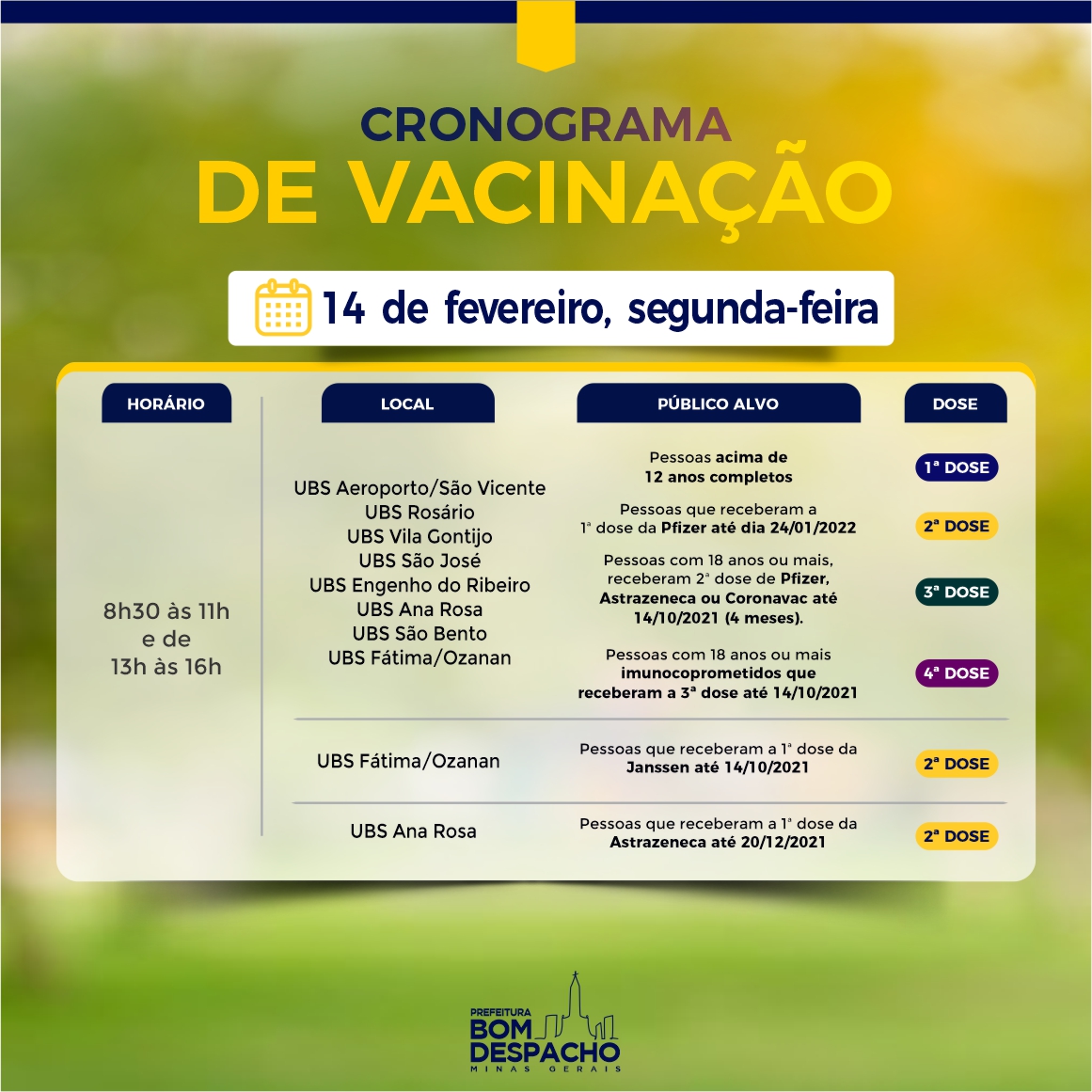 Confira abaixo os cronogramas de hoje (dia 14) da vacinação contra Covid-19 e clique aqui para acessar os requisitos de vacinação.