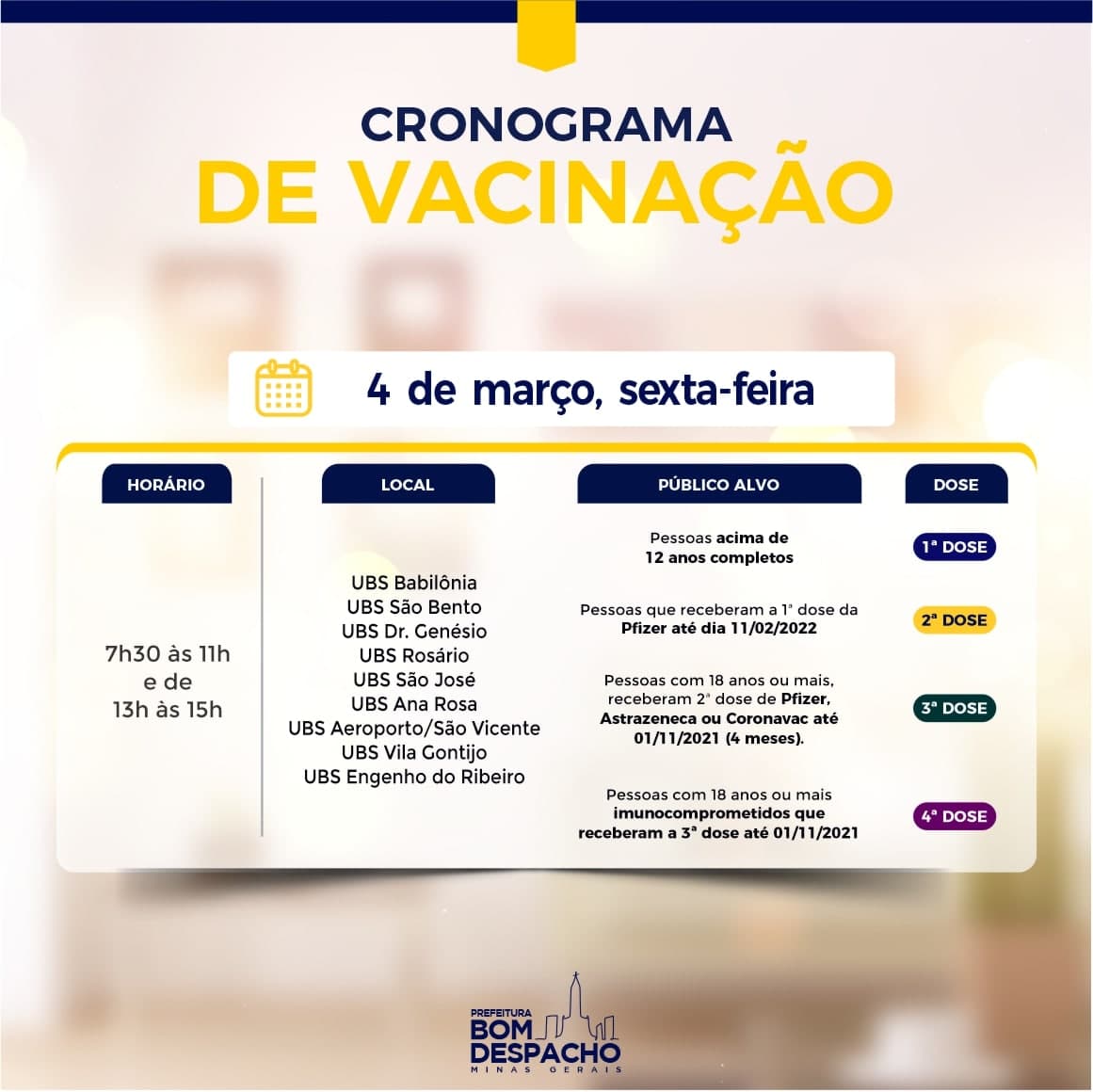 Confira os cronogramas de sexta-feira (dia 4) da vacinação contra Covid-19 e CLIQUE AQUI para acessar os requisitos de vacinação.