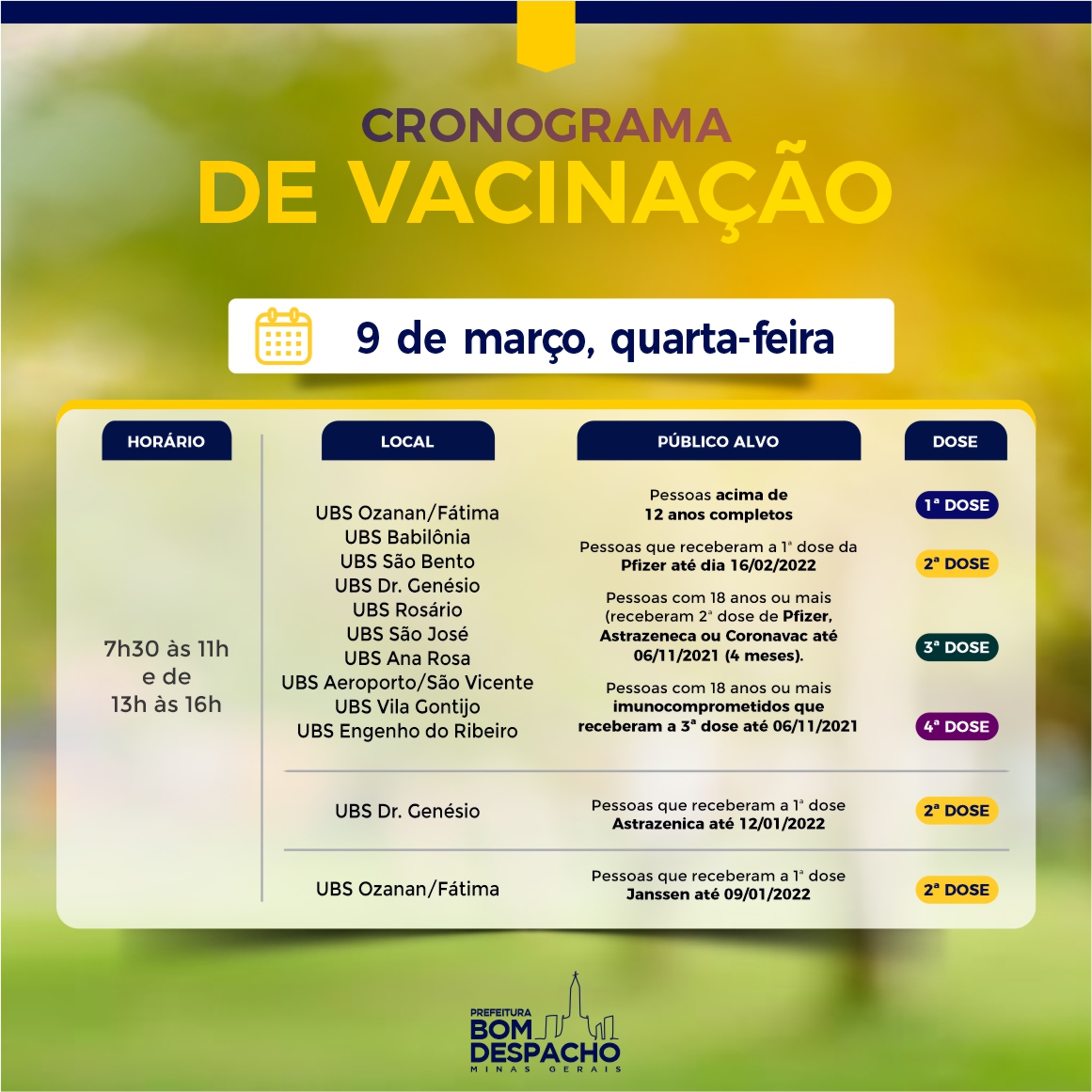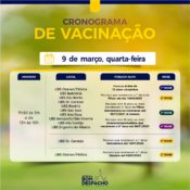 Confira os cronogramas de quarta-feira (dia 9) da vacinação contra Covid-19 e CLIQUE AQUI para acessar os requisitos de vacinação.
