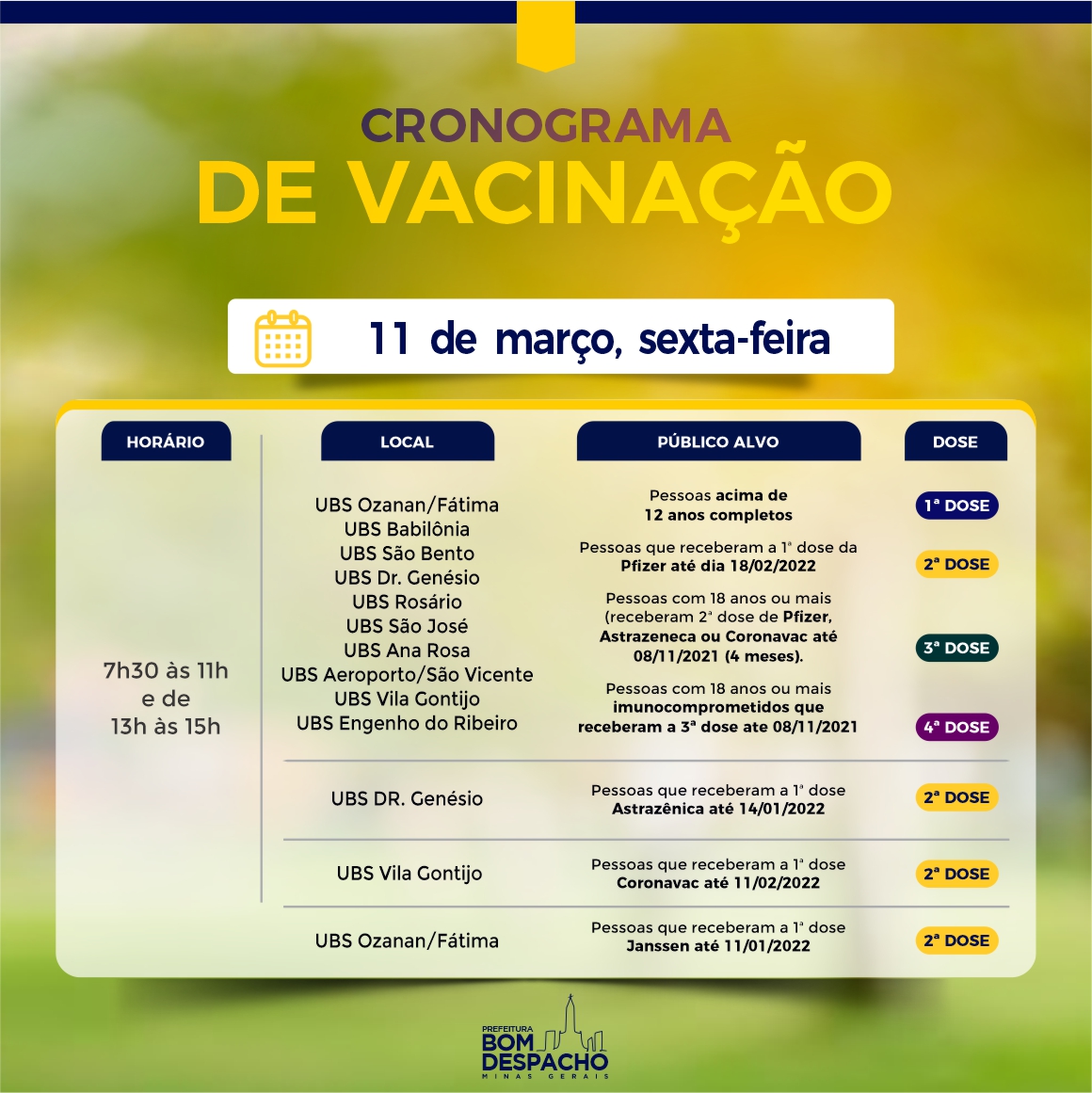 Confira os cronogramas de sexta-feira (dia 11) da vacinação contra Covid-19 e CLIQUE AQUI para acessar os requisitos de vacinação.