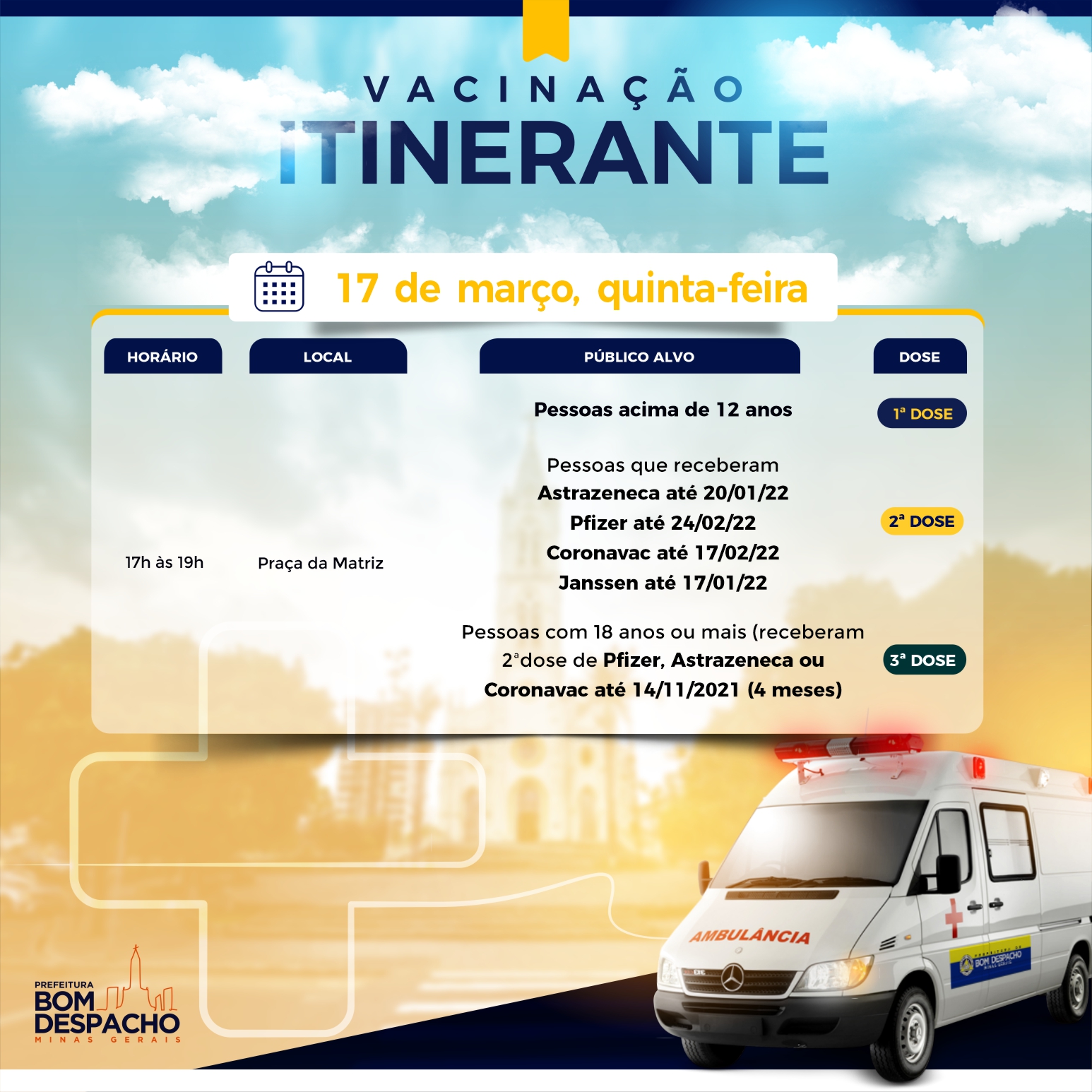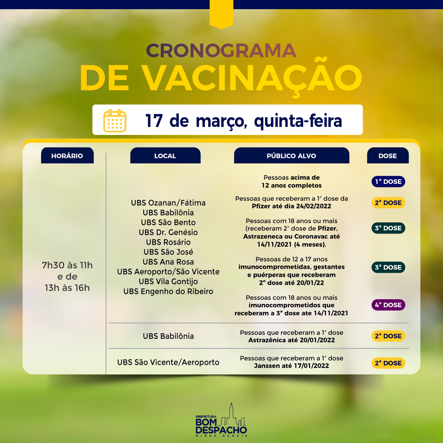 Confira os cronogramas de quinta-feira (dia 17) da vacinação contra Covid-19 e CLIQUE AQUI para acessar os requisitos de vacinação.