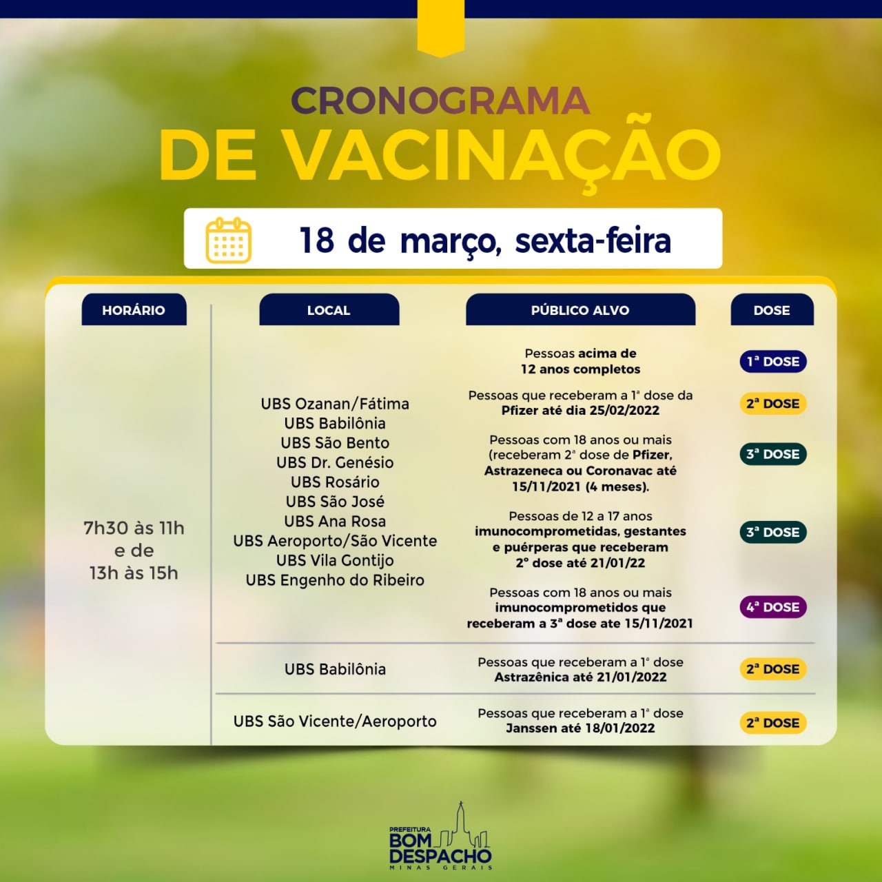 Confira os cronogramas de sexta-feira (dia 18) da vacinação contra Covid-19 e CLIQUE AQUI para acessar os requisitos de vacinação.