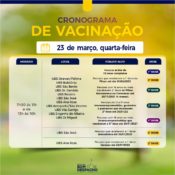 Amanhã, dia 25, a Prefeitura vacinará contra Covid-19 alunos, de 11 anos de idade ou mais, das escolas Chiquinha Soares, no Bairro São João; e Irmã Maria, no Bairro São Vicente. Serão aplicadas vacinas da Pfizer, primeira ou segunda dose.