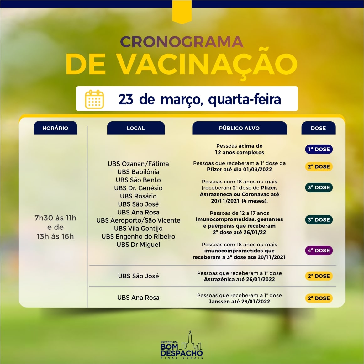Confira os cronogramas de hoje (dia 23) da vacinação contra Covid-19 e CLIQUE AQUI para acessar os requisitos de vacinação.
