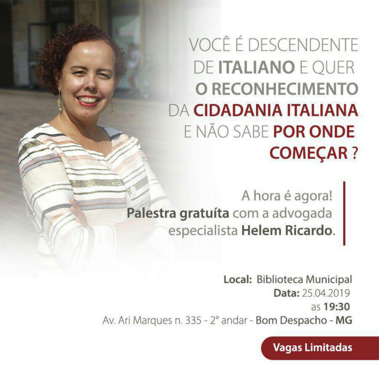 Dia 25 de abril, às 19h30, a biblioteca municipal receberá para palestra, a advogada Helem Ricardo, especialista em Reconhecimento da Cidadania Italiana. Ela irá esclarecer dúvidas e questões sobre como como conseguir a nacionalidade italiana.