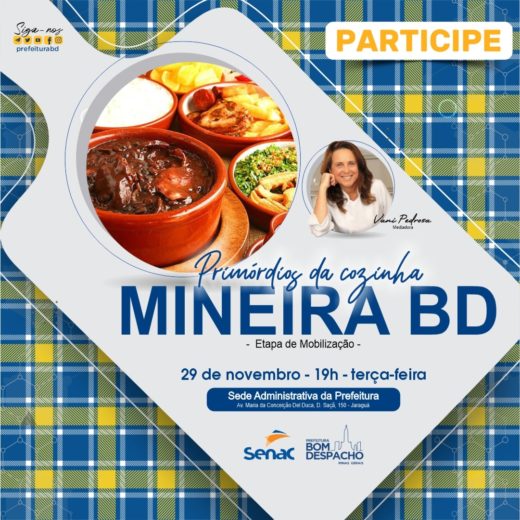 Saiba mais – em parceria com o Senac, a Prefeitura já levantou informações importantíssimas sobre a gastronomia bom-despachenses, com o objetivo de resgatar e valorizar parte da história do Município. Isso será feito por meio da identificação de pratos típicos, preparados com ingredientes cultivados aqui e o registro do modo de fazer essas receitas.