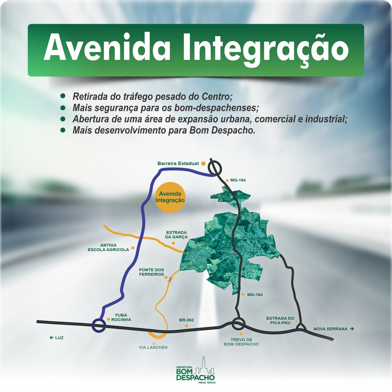 A construção da Avenida Integração representa um marco para Bom Despacho e promete trazer significativos benefícios e impulso ao desenvolvimento. Essa via conectará a BR-262 à MG-164 e se estenderá até o prolongamento da Rua Dr. Juca, no Bairro São Vicente. Serão 3,3 KM de pavimentação da Av Dr. Juca que manterá a largura existente de 14 m, totalizando uma área pavimentada de 86.612,40 m². Já a Avenida Integração terá 15,7 km de extensão com largura de oito metros e aréa total de 125.943,60 m².