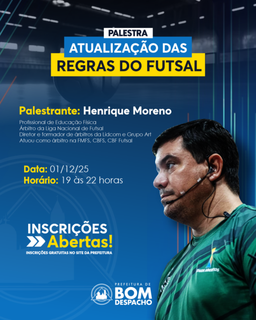 Prepare-se para ficar por dentro de todas as novidades do esporte! A Prefeitura de Bom Despacho promove a palestra gratuita sobre a Atualização das Regras do Futsal.