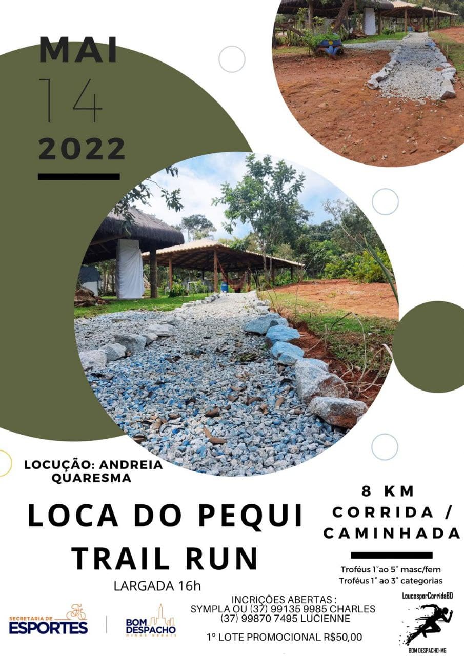 No dia 14 de maio acontecerá a prova Loca do Pequi Trail Run, em Bom Despacho. A Prefeitura está apoiando a ação que conta com percurso de 8 km, corrida e caminhada, em estradas rurais e trilhas.