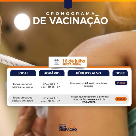 Amanhã (16) a Prefeitura aplicará primeira dose de vacina contra Covid-19 em cidadãos de 43 anos ou mais e segunda dose de Astrazeneca em cidadãos que tomaram a primeira dose até o dia 23 de abril deste ano.
