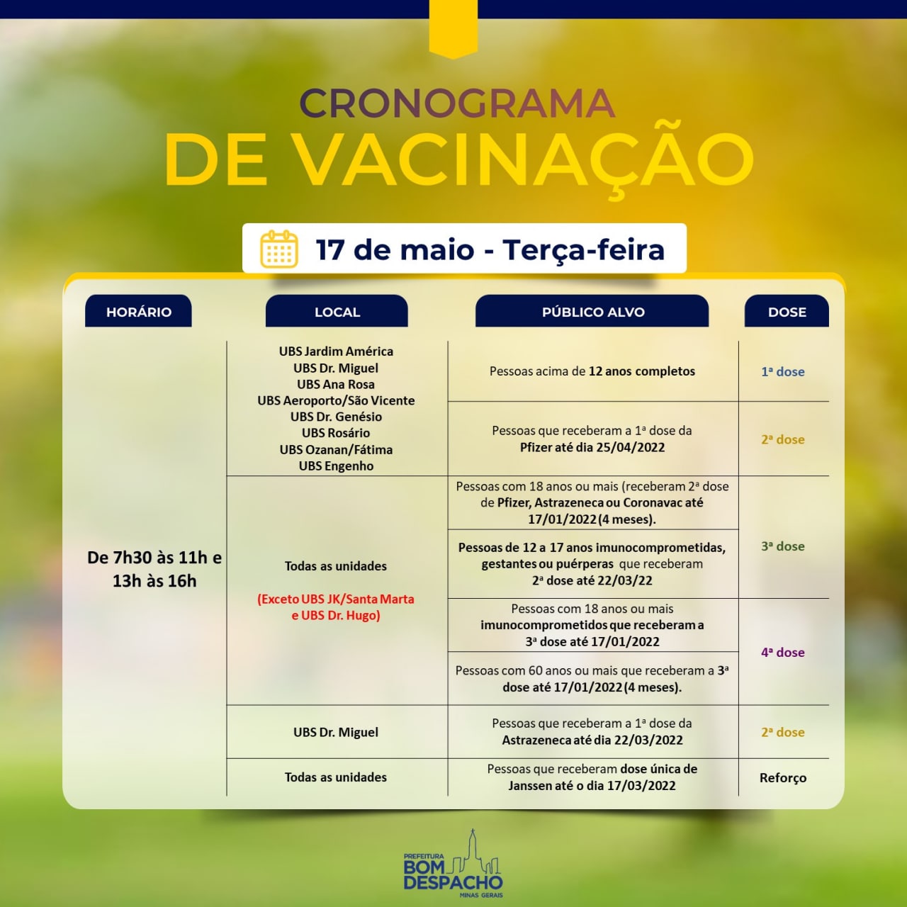 Confira os cronogramas de terça-feira (dia 17) da vacinação contra Covid-19 e CLIQUE AQUI para acessar os requisitos de vacinação.