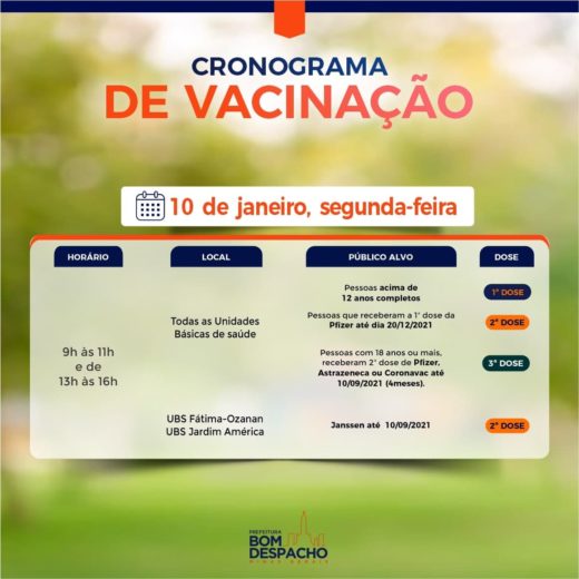 Confira o cronograma do dia 10 de janeiro da vacinação contra Covid-19 e siga também as recomendações da Secretaria de Saúde e imunize-se.