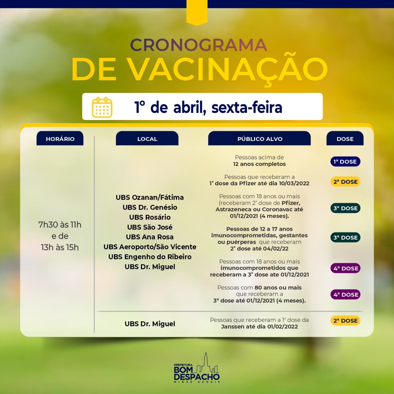 Confira os cronogramas de hoje (dia 1°) da vacinação contra Covid-19 e CLIQUE AQUI para acessar os requisitos de vacinação.