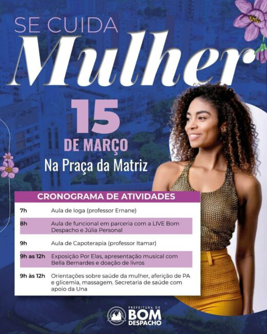 Mulheres de Bom Despacho, esse dia é para vocês! No dia 15 de março, na Praça da Matriz, teremos uma programação especial com atividades físicas, exposição, música e cuidados com a saúde. Venha participar do evento Se Cuida, Mulher e aproveite esse momento dedicado ao bem-estar e empoderamento feminino! 💜✨