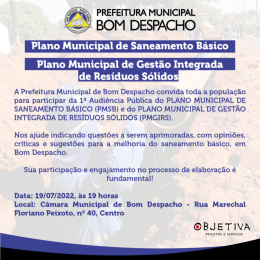 Dia 19 acontecerá a Audiência Pública dos Planos de Saneamento Básico e de Gestão Integrada dos Resíduos Sólidos
