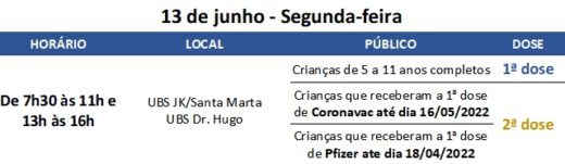 Confira abaixo o cronograma de segunda-feira da vacinação: