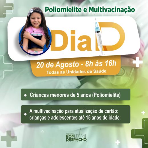 Dia 20, de 8h às 16h, todas as UBS estarão abertas para realizar o Dia D de vacinação contra poliomielite, para crianças de 1 a 5 anos de idade, e multivacinação para atualizar o cartão vacinal para crianças e adolescentes.