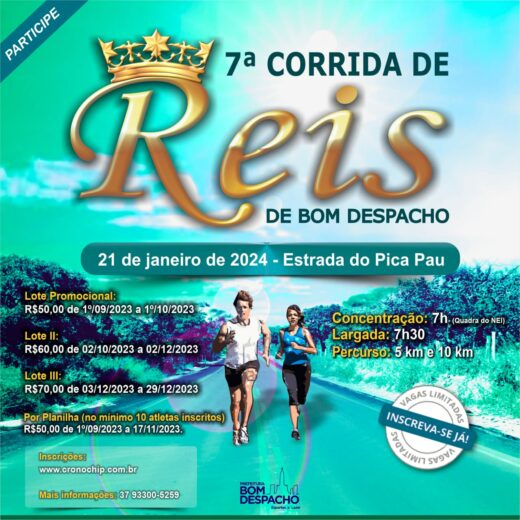 Já estão abertas as inscrições para a 7ª Corrida de Reis de Bom Despacho, que acontecerá no dia 21 de janeiro de 2024.