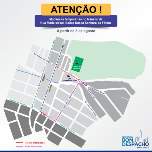A Rua Maria Isabel será interditada temporariamente a partir do dia 8 de agosto, próxima segunda, para manutenção da rede da Copasa. O trânsito seguirá conforme indicado na imagem acima.