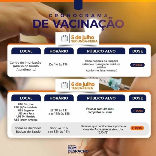 A Prefeitura continuará a vacinação contra Covid-19. Siga as recomendações e confira o cronograma acima.