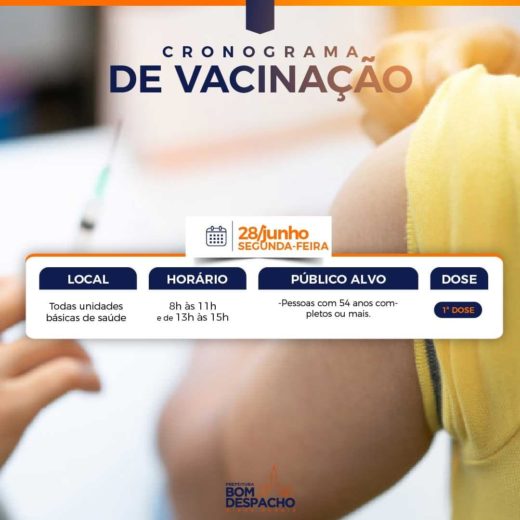 No dia 28, a Prefeitura realizará a vacinação de primeira dose contra o coronavírus de pessoas com 54 anos ou mais. Para se imunizar, os cidadãos devem se dirigir à Unidade Básica de Saúde do seu bairro de 8h às 11h ou de 13h às 15h.